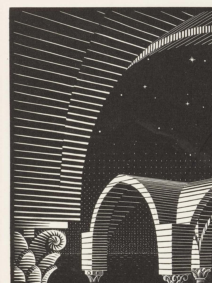 Op deze houtgravure zien we wat lijkt op een marmeren sarcofaag van een religieus figuur. Op zijn hoofd prijkt een mijter, waarmee dit dus een bisschop zou zijn. Op zijn borst zit een gigantische bidsprinkhaan. Escher plaatst ze in een gewelf dat door de vorm associaties oproept met een kerk. Los in de ruimte staan nog een tweede gewelf en een derde gebouw. Het grondvlak waar ze op staan, houdt plotseling op. Daarachter is niets, een suggestie van een leegte die zich tot het oneindige uitstrekt.