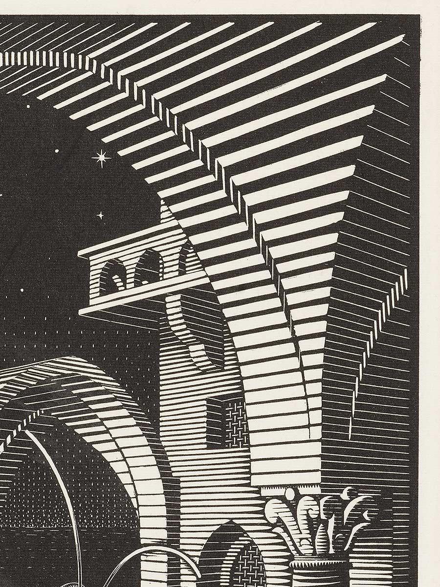M.C. Escher, Droom (Mantis Religiosa), houtgravure, april 1935