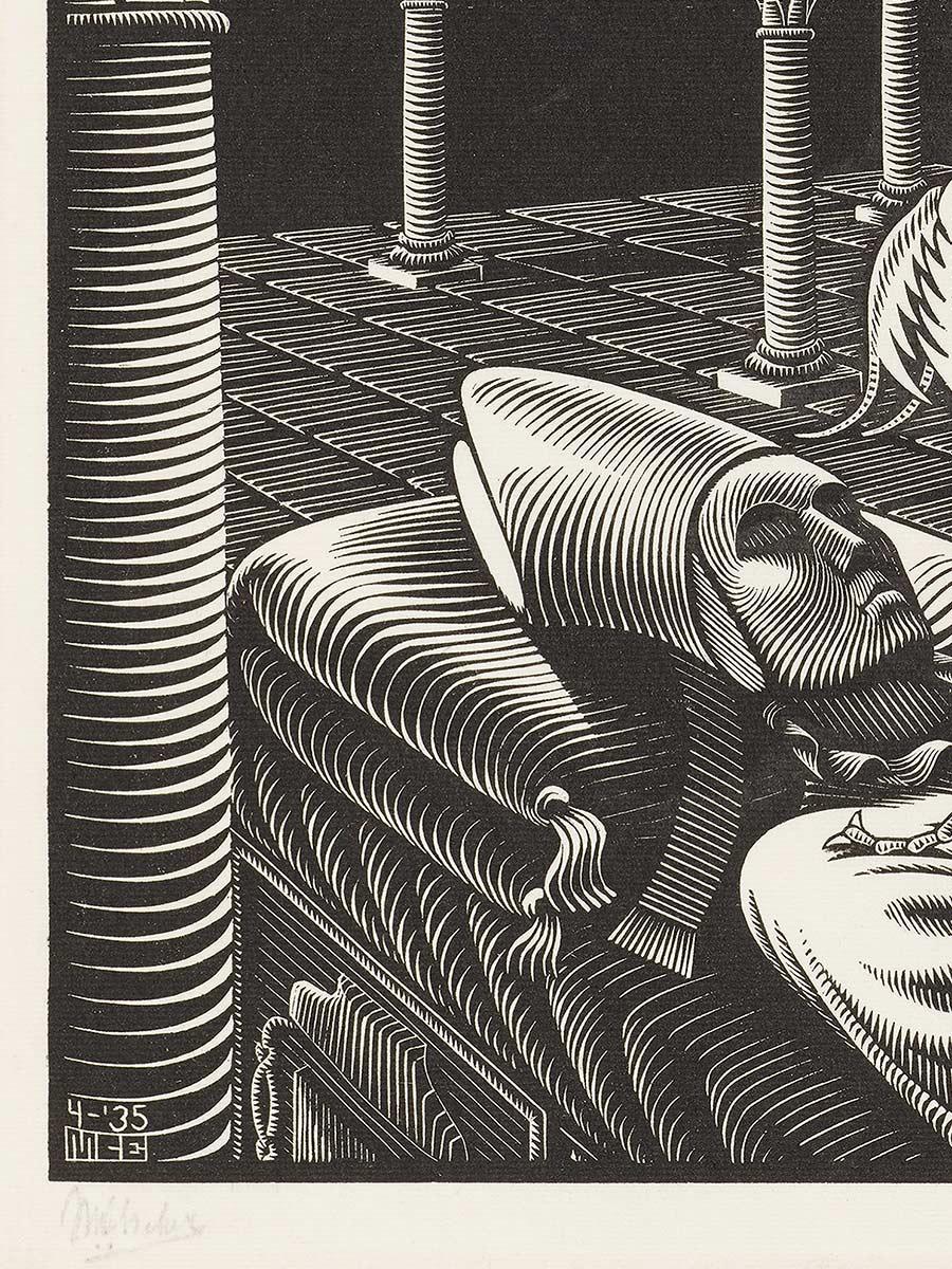'The print Dream combines three distinct elements: first the architecture, a reminiscence of a curious little twelfth-century church in southern Italy. It consisted of loose cross vaults under on overhanging rock. Secondly, the marble sarcophagus with the recumbent figure of a bishop, which l saw in the crypt at Saint Peter’s in Rome. And thirdly, an insect common in southern Italy, a praying mantis. It sat down on the edge of my drawing folder, while l was sketching somewhere in Sicily, long enough to be pictured in detail. My only intention was to suggest an impression of three-dimensionality, of endless depth.'