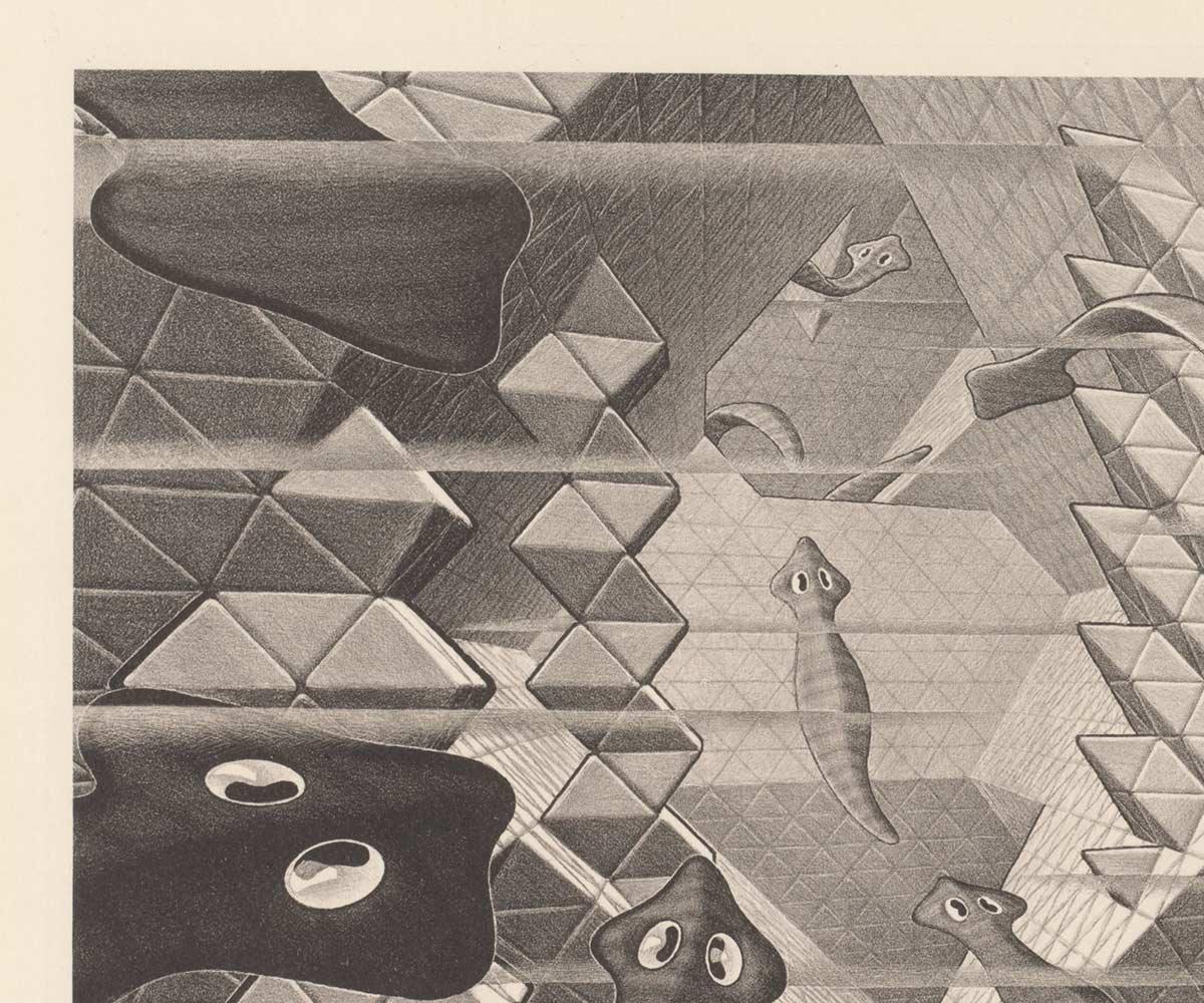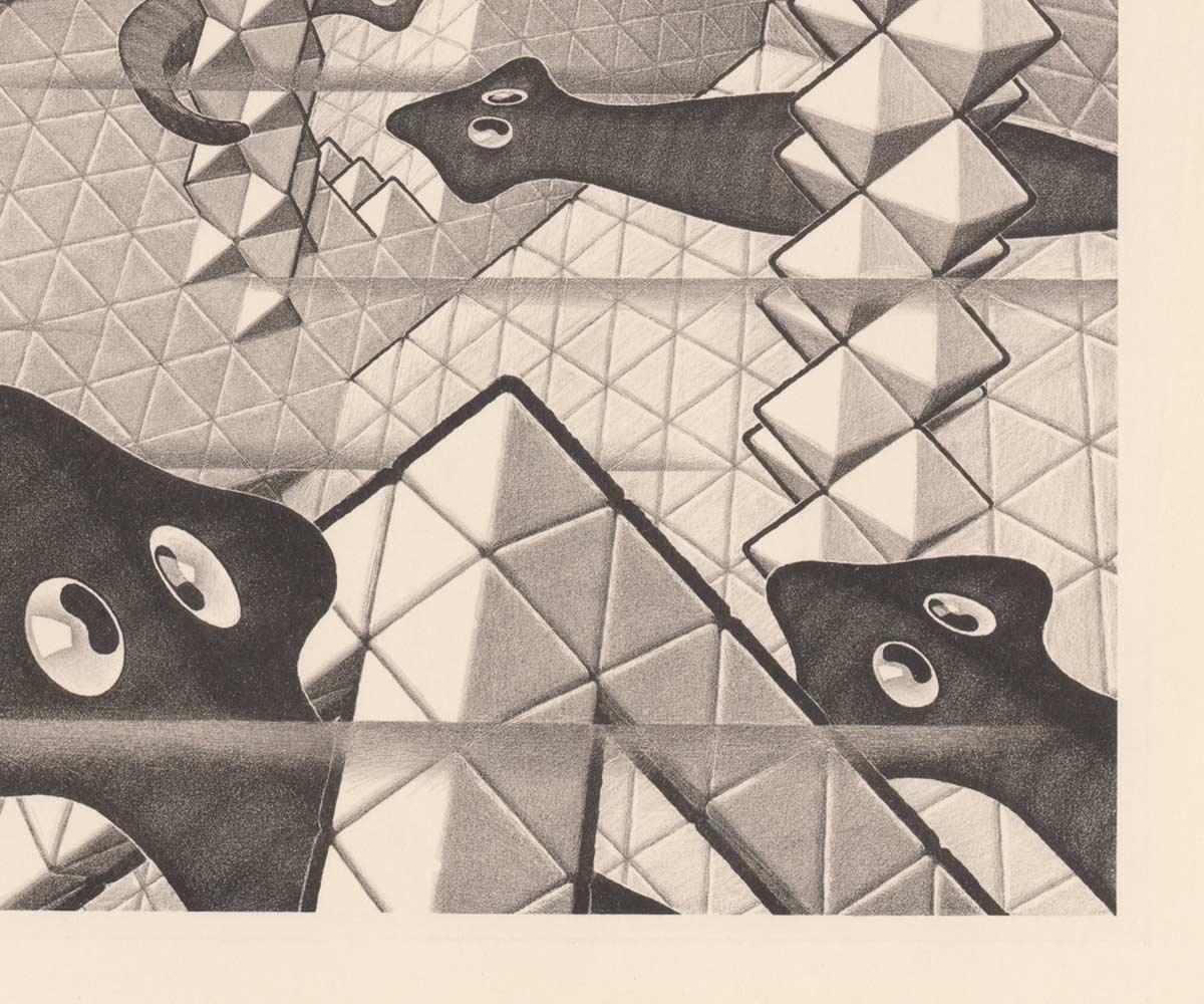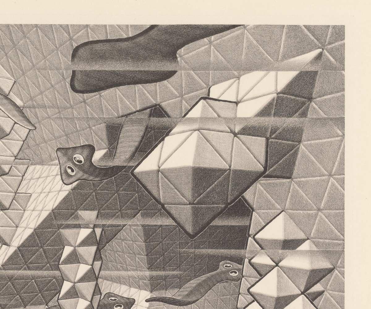 De leefruimte van de platwormen is dus volledig gebouwd met tetraëders en octaëders, geschakelde vierzijdige piramides. Het vereist wat ruimtelijk voorstellingsvermogen om een dergelijke ruimte voor je te zien, maar Escher draait er zijn hand niet voor om. Hij was al goed bekend met deze vormen, waarvan hij driedimensionale modellen in zijn atelier had staan en hangen.