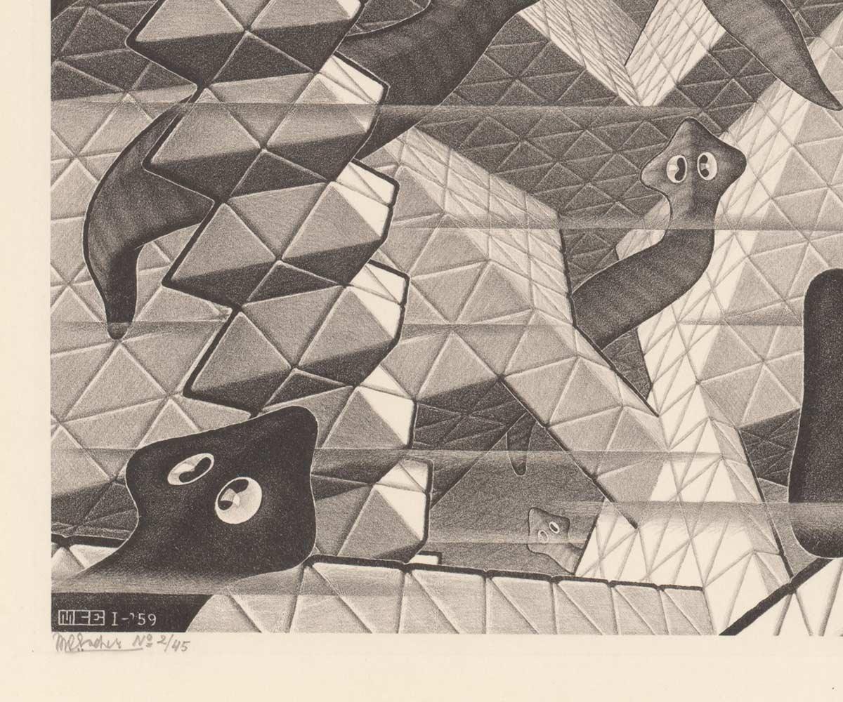 In december 1958 en januari 1959 werkte Escher aan een nieuwe prent die hij wilde tonen op een tentoonstelling in museum Boymans (nu: Museum Boijmans Van Beuningen) in februari. Onder de naam Vier Grafici exposeerde hij samen met Harry van Kruiningen, Wout van Heusden en Harry Disberg. Een gezelschap waarin hij al eerder had verkeerd. Hij schreef over de prent in een brief aan zijn zoon George en diens vrouw Corrie:*