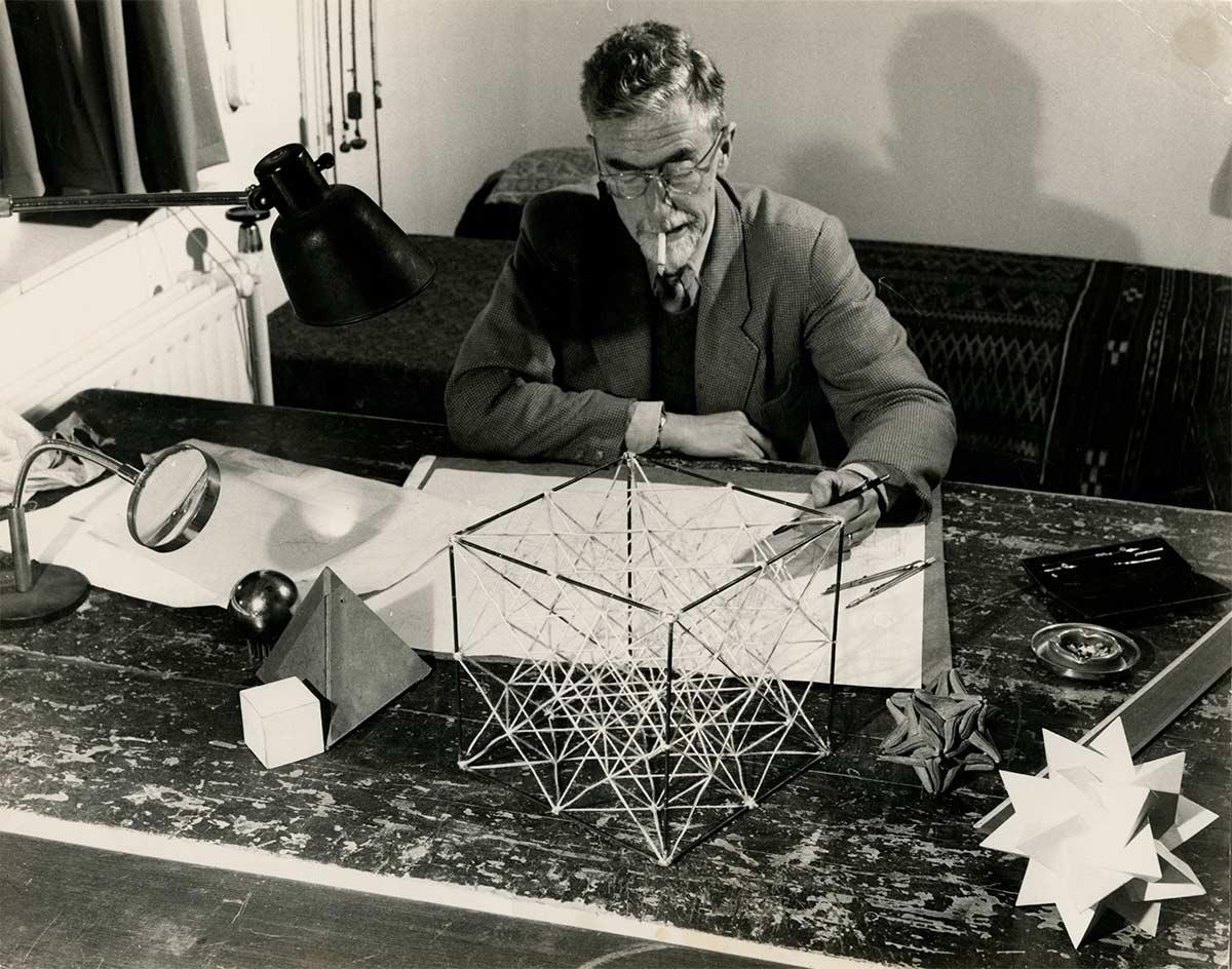 "Na een weekje van nameloze dispiratie, ben ik weer aan ‘t graven in de domeinen der tetra- en octaëdrische ruimte: spelonken en holen, wonderlijke pilaren, afgronden en vergezichten, alles rigoureuselijk vier- en achtvlakkig. Het is mijn plan om er nu eindelijk de schele platworm, waarvoor ik een zwak heb, in te laten rondzwemmen."