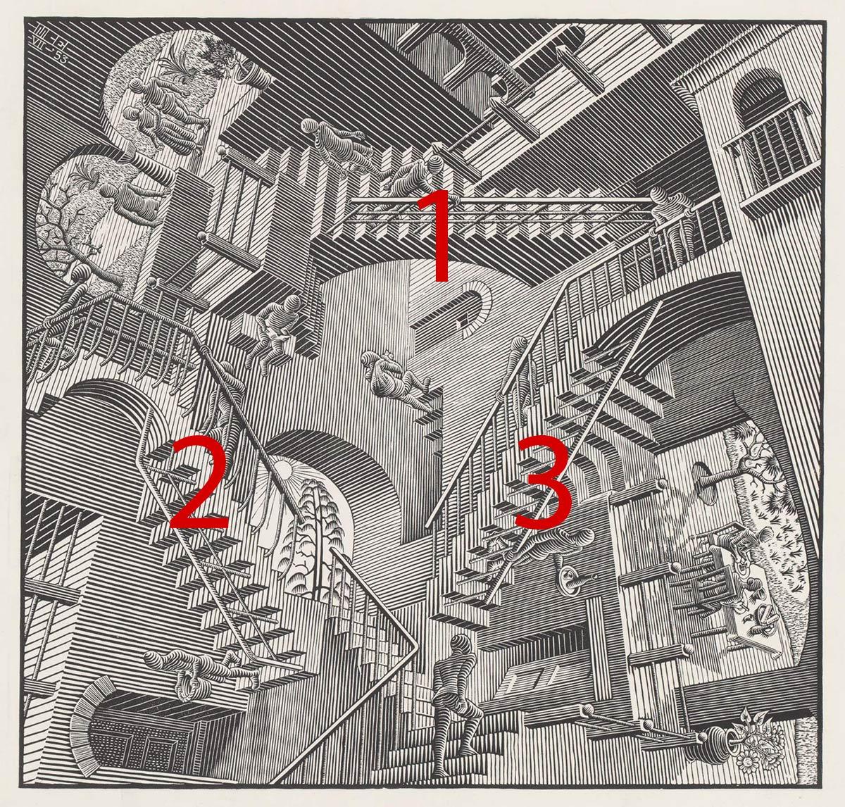 In de foto hieronder heb ik de drie ruimtes een nummer gegeven. Escher misleidt ons op een uiterst slimme manier.