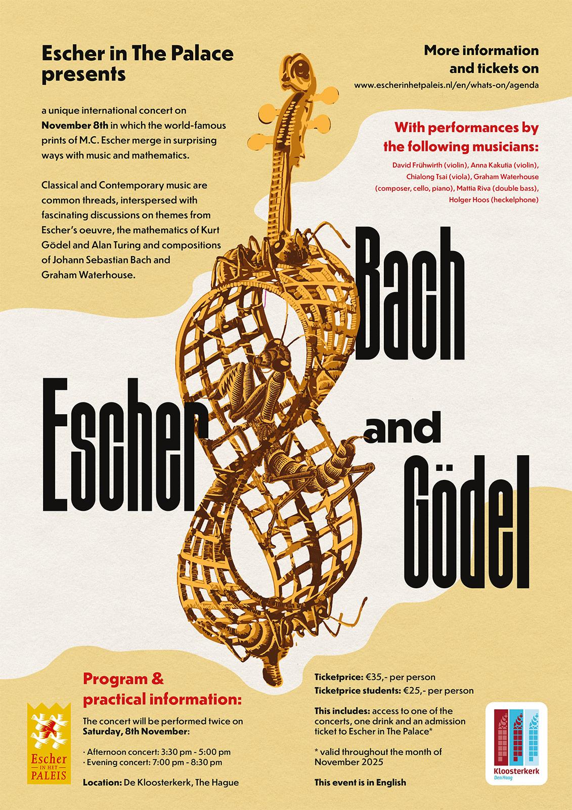 Escher in Het Paleis organiseert een uniek concert waarin de wereldberoemde prenten van M.C. Escher op verrassende wijze samenvloeien met muziek en wiskunde. Klassieke muziek vormt de rode draad, afgewisseld door boeiende gesprekken over thema’s uit Eschers oeuvre, de wiskunde van Kurt Gödel en Alan Turing, en de composities van Johan Sebastiaan Bach.