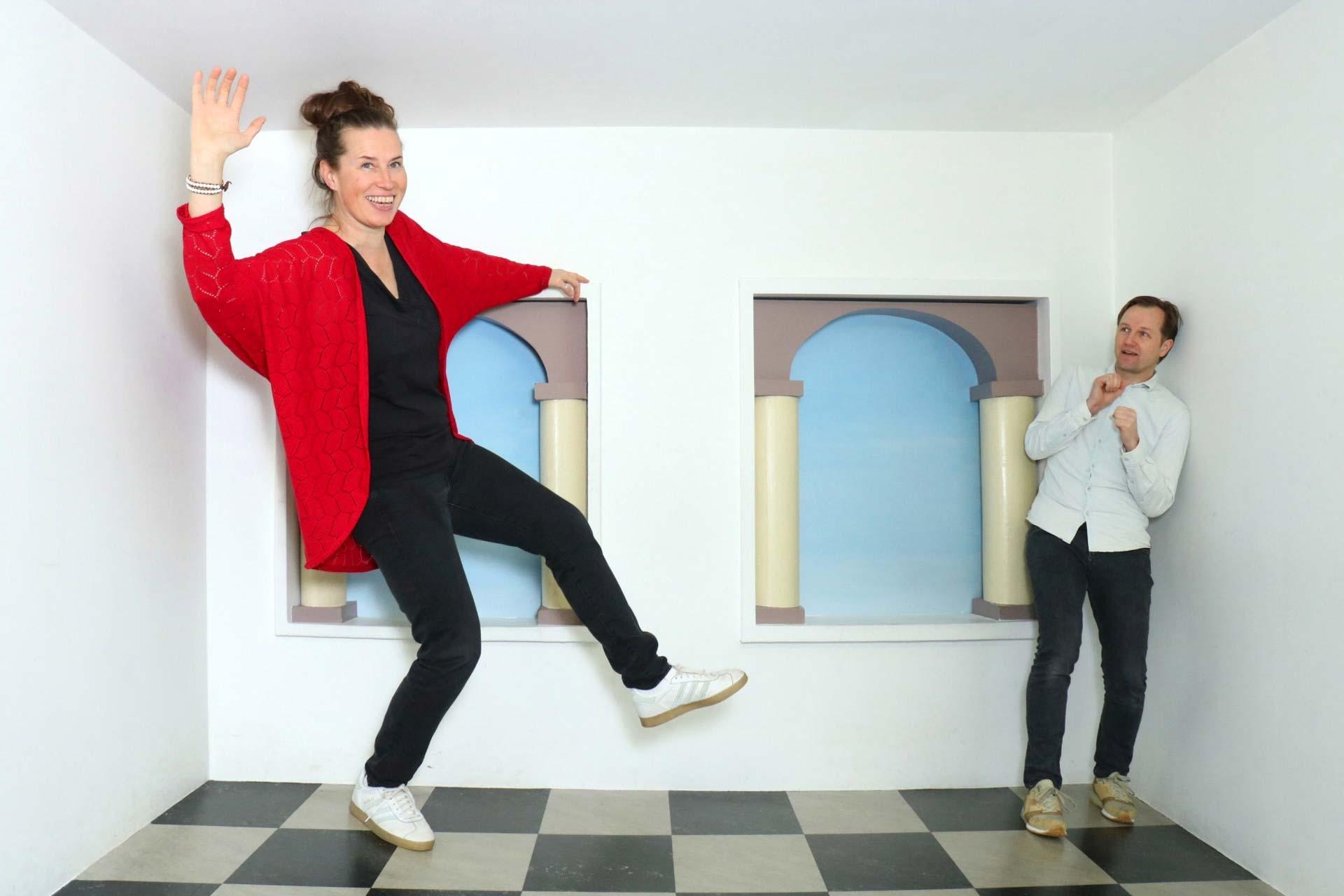 Op de tweede etage leert u kijken als Escher in een interactieve tentoonstelling. Puzzel met uw ogen, ontdek met uw handen en word deel van Eschers beleving. Stap binnen in zijn illusie en groei tot reus of krimp tot minimens in enkele seconden. Kom nog dichter bij Escher door uw eigen vlakvulling te maken of zelf aan de slag te gaan met onmogelijke figuren.